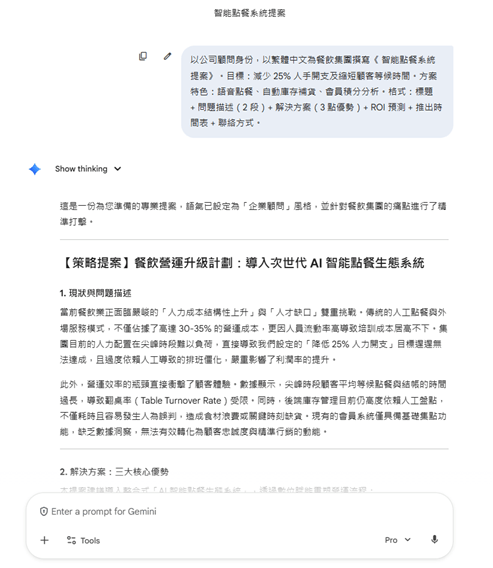 以公司顧問身份,以繁體中文為餐飲集團撰寫《 智能點餐系統提案》。目標:減少 25% 人手開支及縮短顧客等候時間。方案特色:語音點餐、自動庫存補貨、會員積分分析。格式:標題 + 問題描述(2 段)+ 解決方案(3 點優勢)+ ROI 預測 + 推出時間表 + 聯絡方式。