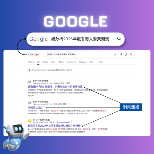 相比之下, Google 搜尋主要提供網頁連結列表,用戶需要自行點擊不同網頁並整合內容。雖然這種方式提供較多原始資訊,但用戶需要花更多時間來過濾及整合資訊。